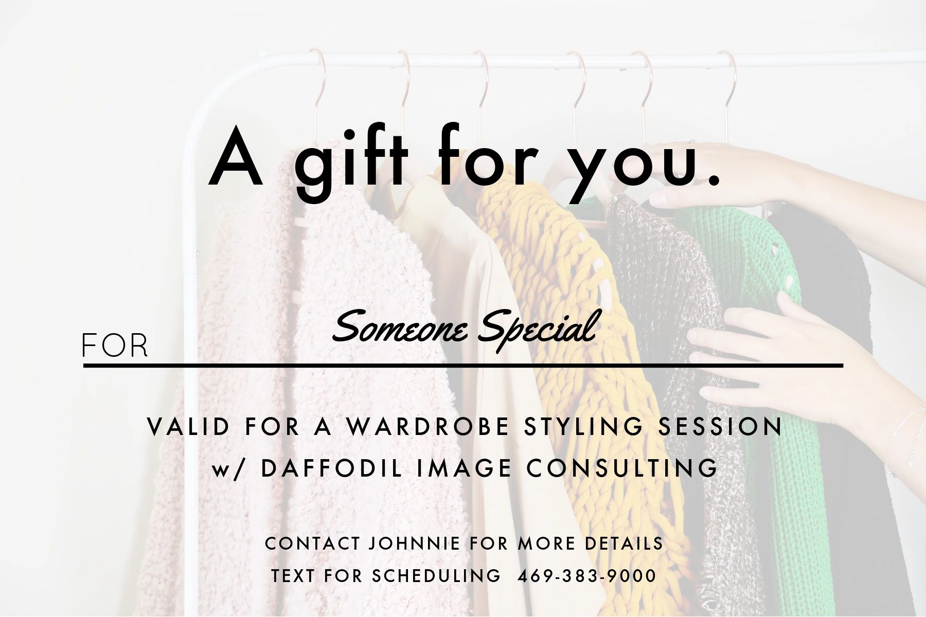 NOTE: Must have already had a Body Type & Style Aesthetic analysis done with Daffodil Image Consulting. This ensures that I feel comfortable enough with your personal style needs, to offer wardrobe options.